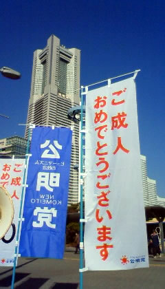 今日は横浜アリーナにおきまして、「成人の日を祝うつどい」があり、初めて参加をさせて頂きました。約3万4千名の方が成人となられたとのことですが、新しい力と発想で、横浜の新たな歴史を築いて頂きたいと念願するものです。私自身の成人式を思い出しますと、その当時は大学生で、クラブの練習に明け暮れていました。従いまして、今日のような晴れやかな式典には参加できませんでした。新成人の皆様にとっても、これからも様々なことが待ち受けているかと思いますが、桜梅桃李(それぞれの個性を活かすこと)の人生を共々に歩んで参りましょう。