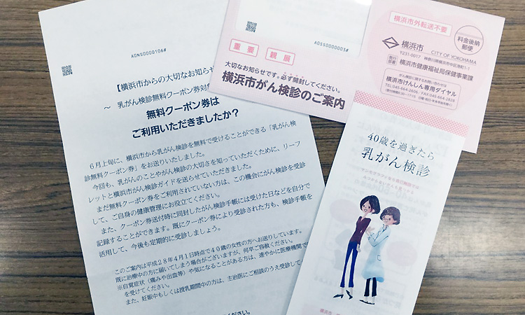 横浜市では無料クーポン券(子宮頸がんは20歳、乳がんは40歳)を、対象者の方(約47,000名)に6月上旬に送付しています。