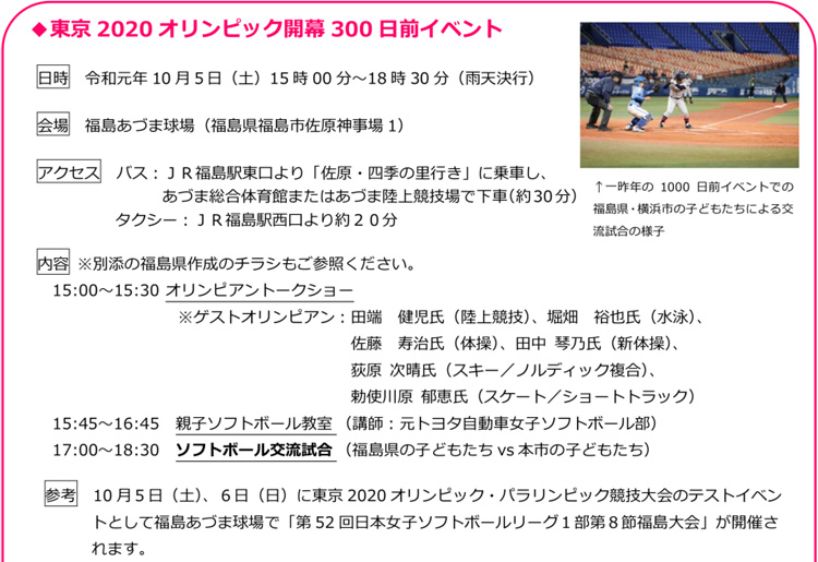 東京オリンピックまで300日あまりとなりましたが、10月5日には福島県において、東京2020オリンピック開幕300日前イベントが開催されます。