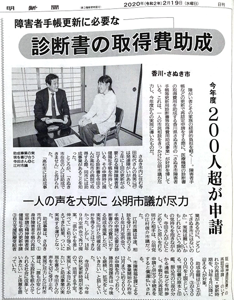 本日の公明新聞に、香川県さぬき市でスタートした、障害者手帳の更新時に必要な診断書を取得する際の費用助成に関する記事が掲載されていました。
