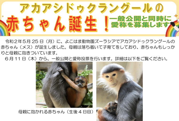 その再開を前にアカアシドゥクラングールの赤ちゃん誕生のニュースが入り、その愛称の投票(6月22日まで)が行われるとの事です。タイとシンガポールの動物園から来た両親のもとで生まれた赤ちゃんサルですが、横浜で元気に育って欲しいと思います。