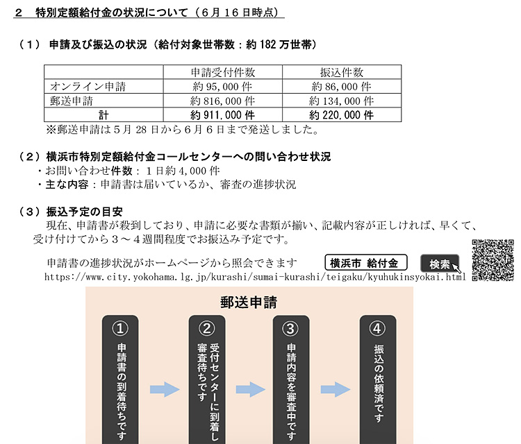 横浜市から特別定額給付金の申請状況などについて発表がありました。給付対象となる182万世帯のうち、約半数の世帯から申請があったとの事です。