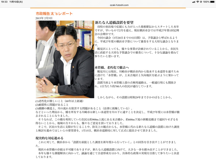 今般、鶴見川に新たな人道橋の整備が決まりましたが、地域の方々から、ある広報紙について問い合わせを頂きました。
