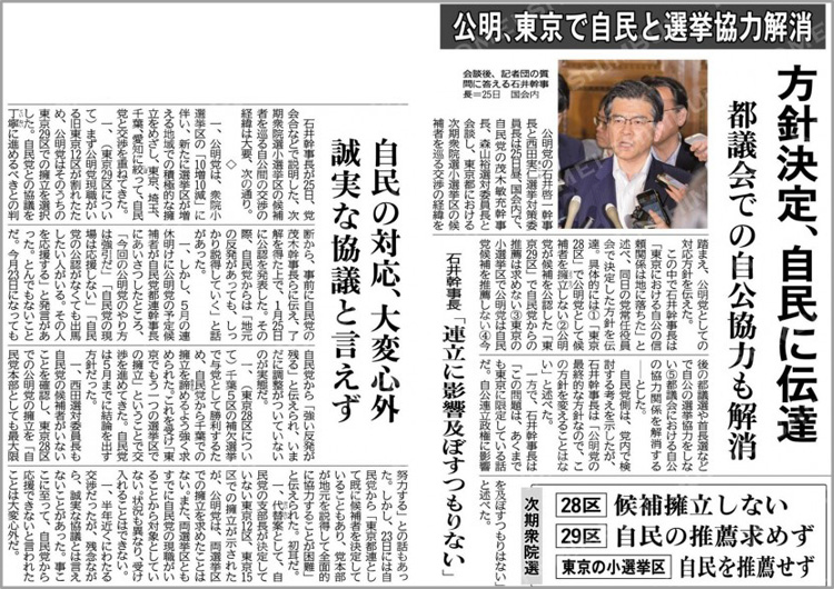 東京都における公明党と自民党の選挙協力に関して様々な報道を目にします。これまで20年以上にわたり関係を構築して来たにも関わらず、今回の交渉経緯から「信頼関係は地に落ちた」と言わざるを得ない状況になったことは残念です。