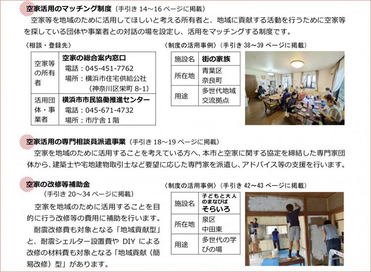 横浜市では、空家化の予防、空家等の流通・活用促進、管理不足空家等の防止・解消の3つを柱に空家等対策を進めています。今般、新たな「空家の地域活用の手引き」が完成しました。活用事例や改修にあたってのポイントなど、役立つ情報が盛り込まれています。