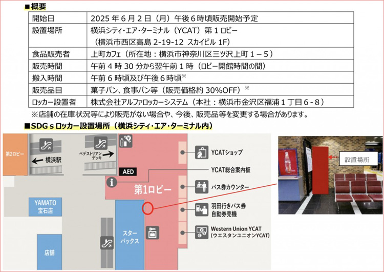このたび廃棄物削減に資する取組として、横浜シティ・エア・ターミナルに消費期限内ながら廃棄されてしまう専門店のパン等を購入できるSDGsロッカーを設置しました。