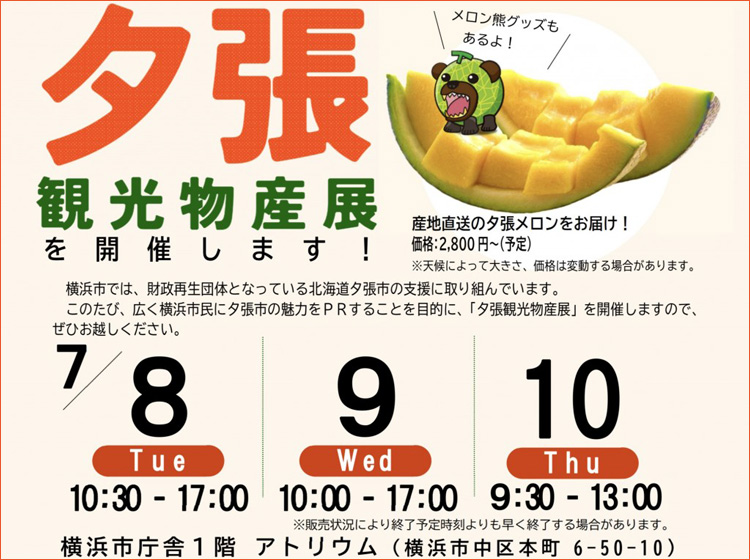 横浜市役所では、恒例となった北海道夕張市の観光物産展が開催されます。(7月8日〜10日)