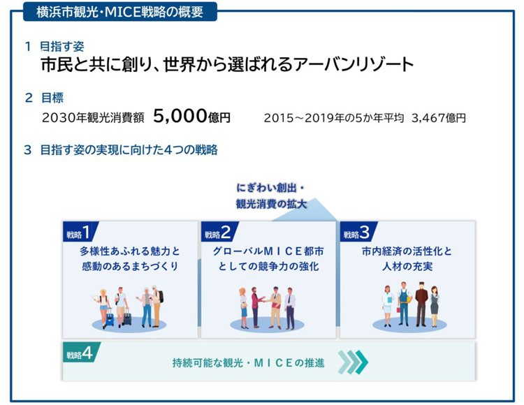 横浜市では、事業者や市民の皆様とともにオール横浜で持続可能な観光・MICEを推進するため「横浜市観光・MICE戦略」を策定しました。2030年の観光消費額の目標を5000億円として、DMOを中心に具体的な取組が進められます。
