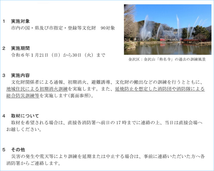 昭和30年には1月26日を「文化財防火デー」と定め、大切な文化財を火災等の災害から守るため、全国的に防災訓練等が実施されています。横浜市内では總持寺や三溪園などで実施される予定です。