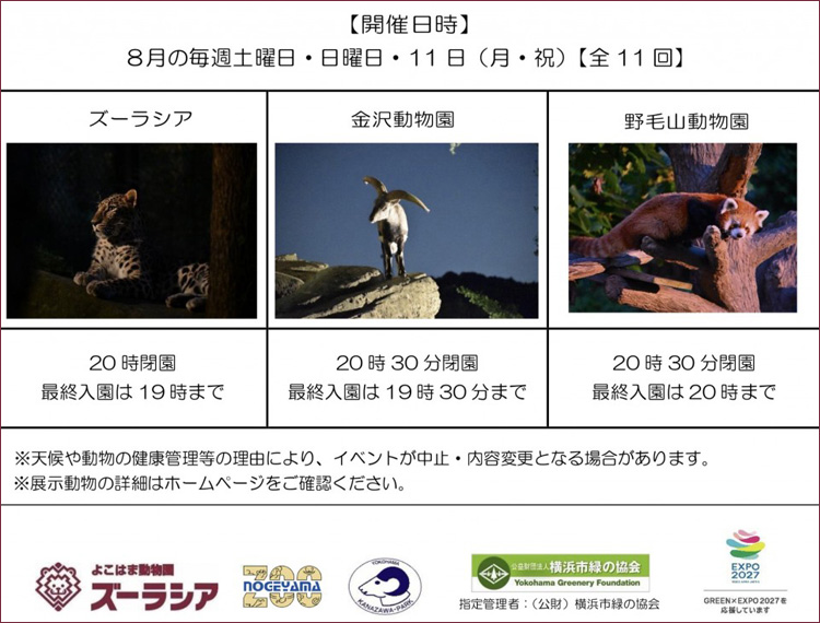 横浜の動物園(よこはま動物園ズーラシア・野毛山動物園・金沢動物園)では、8月の毎週土・日と11日(月・祝)に開園時間を延長し、夜の動物園を開催します。イルミネーションに彩られた園内で、 昼間とは違った動物たちの様子をお楽しみ頂けます。また動物ガイドなどのイベントも実施予定です。