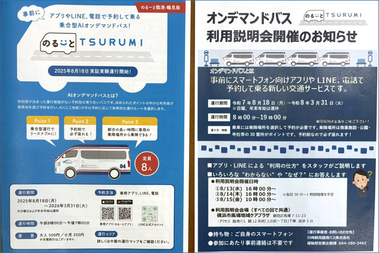 鶴見区の馬場・上の宮・獅子ヶ谷エリアでは、オンデマンドバス「のるーとTSURUMI」の運行が始まります。