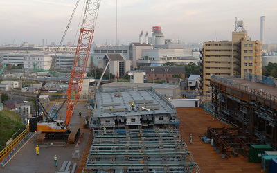 現在、JR等の線路をオーバーハングするための橋げたを製作中で、来年にはその橋げたをレールにより送り出すことで、反対側の橋脚に接続させるという、今までに見たこともない工事が行われる予定です。無事故での工事進捗を願うものです。