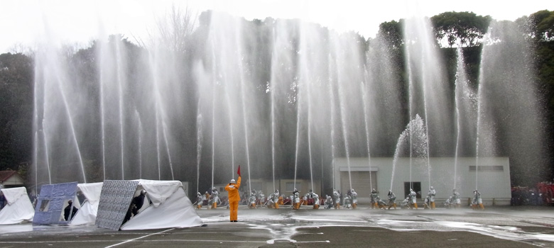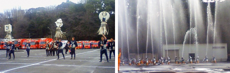 出初式では、挨拶や表彰に続き、潮田中学校マーチングバンドの演奏や分列行進、さらに消防総合演技等が披露されました。