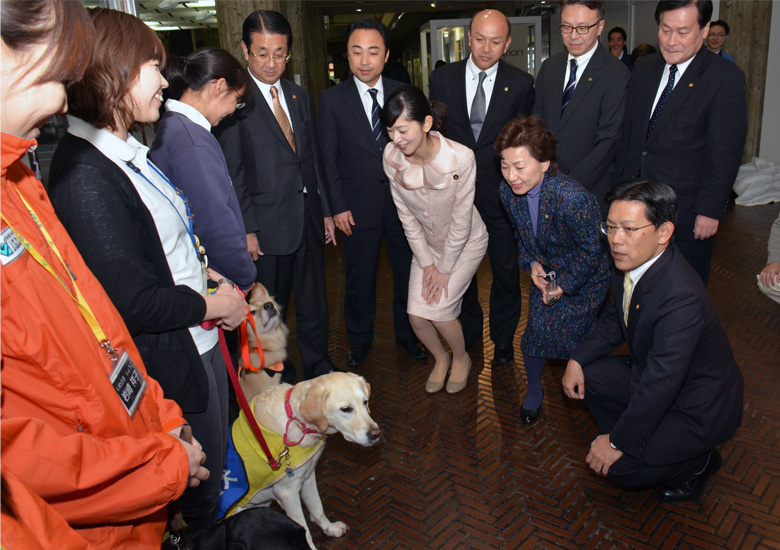 今日は横浜市会に補助犬たちが勢ぞろいし、それぞれの役割や活躍についてデモストレーションが行われました。