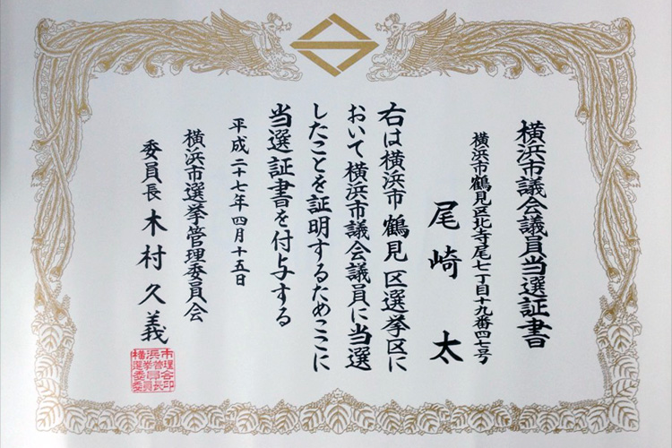 当選証書 2015年4月15日 今日は鶴見区役所において、当選証書付与式が行われました。いよいよ2期目のスタートとなります。 鶴見区には多くの課題がありますが、その解決のために、予算を確保し、具体的な政策を進める必要があります。 議会での合意形成を果たしながら、与えられた任期を全力で働いて参ります。