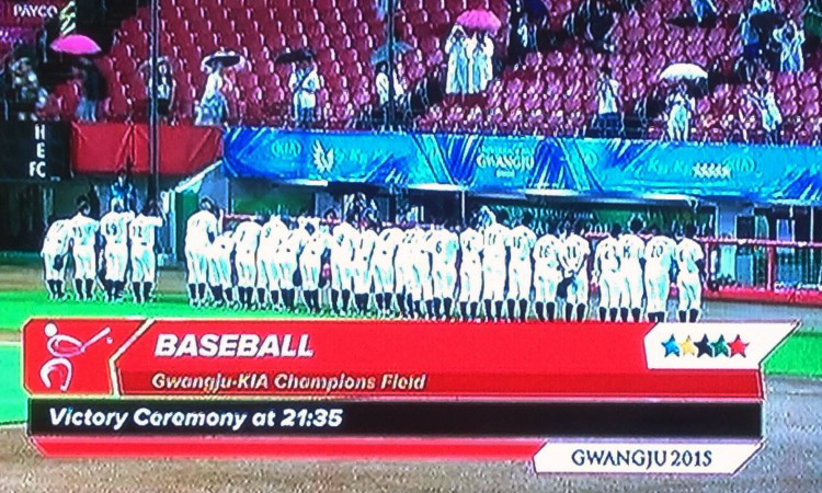 ユニバーシアード決勝〜その2 2015年7月11日 心待ちにしていた決勝戦、残念ながら降雨のため中止となり、両チーム優勝になりました。 2時間以上も待たされた様ですが、選手のコンディションなどを考えると、ちょっと長すぎかと思います。 田中投手の勇姿は秋のリーグ戦までお預けです。