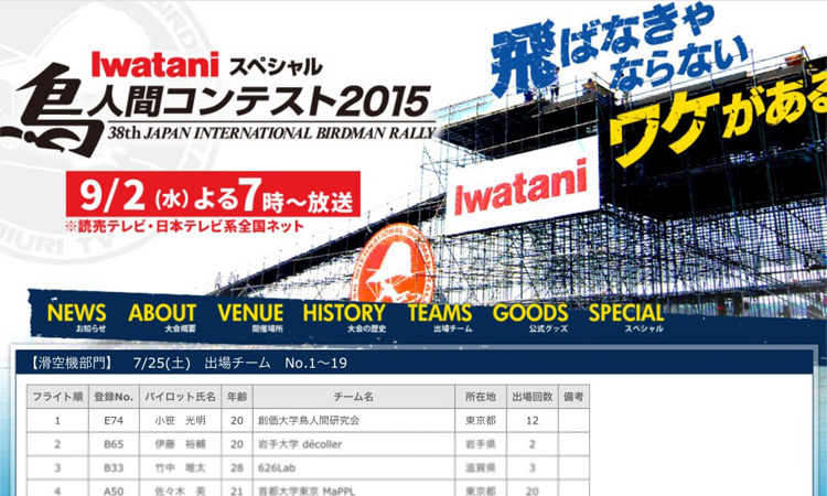 鳥人間コンテスト2015 2015年 9月 2日 今晩19時から日本テレビで放送される鳥人間コンテスト2015に母校の鳥人間研究会がエントリーし、滑空機部門の1番目に登場します。 すでに出場回数も12回ということですが、野球部や駅伝部にも負けない飛びを期待しています。