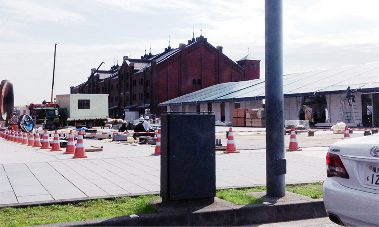 市庁舎に向かう途中、赤レンガ倉庫前で横浜オクトーバーフェストの準備工事が目にとまりました。