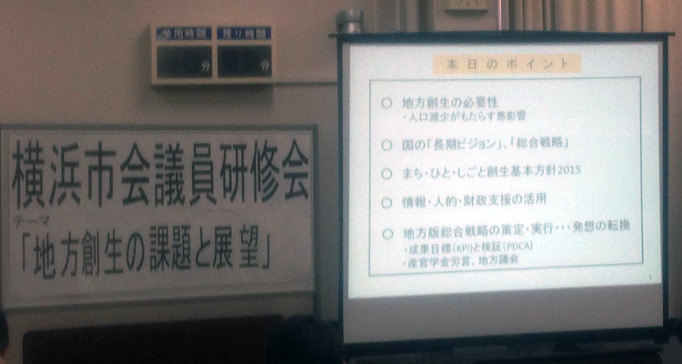 横浜市会議員研修会 2015年 9月 4日 今日は「地方創生の課題と展望」とのテーマで、議員研修会が開催されています。 講師には内閣官房まち・ひと・しごと創生本部事務局次長である末宗氏を迎えて、横浜市の課題とその対応についてヒアリングしています。 改めて人口減少や高齢化社会の影響がいかに大きいかを痛感した次第です。