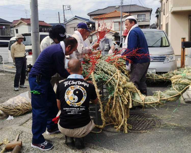 早朝より、地域に方々が伝統の作業方法で、3体の蛇を製作されていますが、ちょうど旧東海道の巡り歩きツアーの方々も見学に立ち寄られていました。