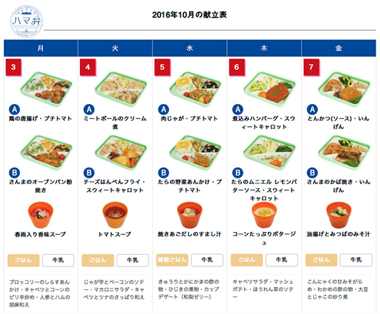 献立表 2016年9月22日 本年度より順次、市立中学校でスタートしているハマ弁ですが、2016年10月の献立表を見る機会がありました。 おかずはともかく、汁物のバリエーションに驚きました。 栄養バランスのとれた温もりあるハマ弁が、生徒や保護者にしっかりと認知され、定着していく事を期待するものです。