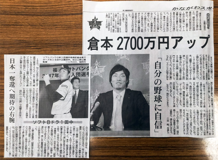 今日の神奈川新聞スポーツ欄には、母校創価大学出身のDeNAベイスターズの倉本選手と、ソフトバンクの田中投手が同時に掲載されています。
