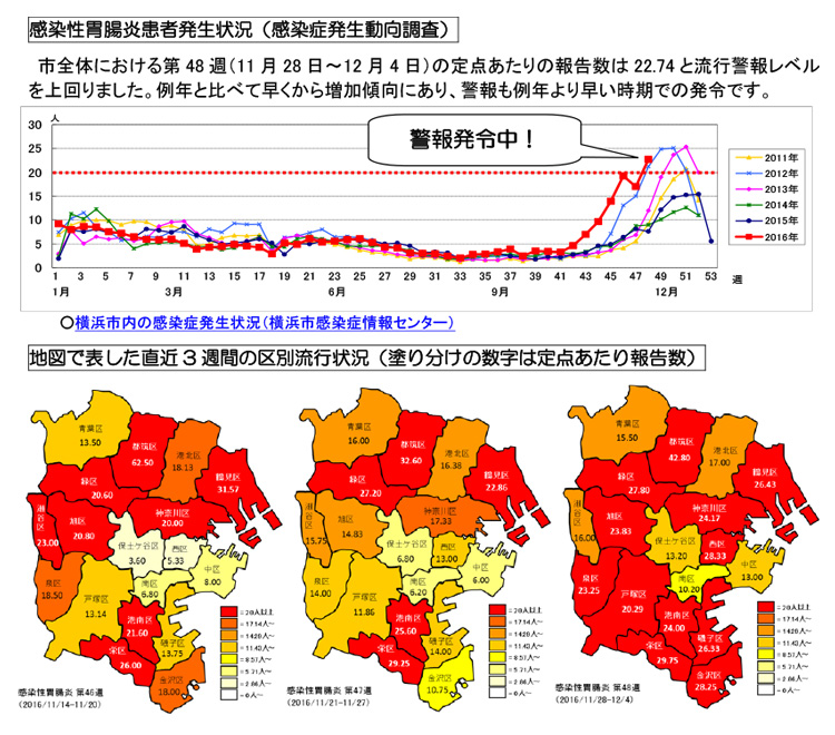横浜市では、感染性胃腸炎(ノロウイルス)の流行警戒発令が出されています。