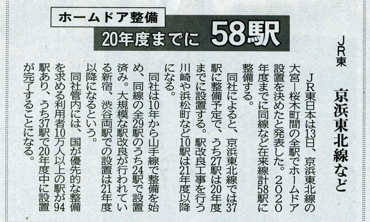 今朝の新聞で、京浜東北線の大宮駅から桜木町駅の全駅に、2020年までにホームドアが整備されるとの記事が掲載されています。