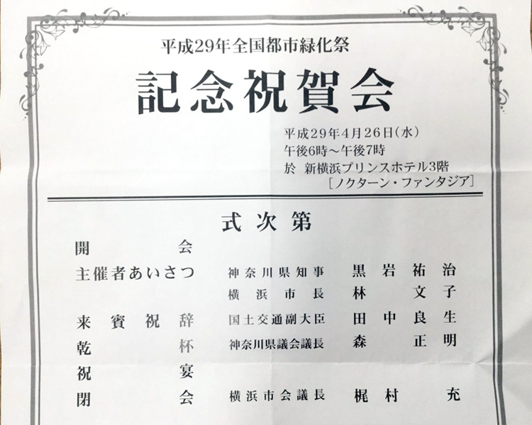 昨日は、6月4日まで開催されている、第33回全国都市緑化よこはまフェアの中心的行事である全国都市緑化祭(大さん橋ホール)、並びに祝賀会が開催されました。