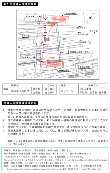 これは鶴見区内の課題の一つである生見尾踏切の安全対策に関するもので、跨線人道橋整備位置の変更案が示されています。
