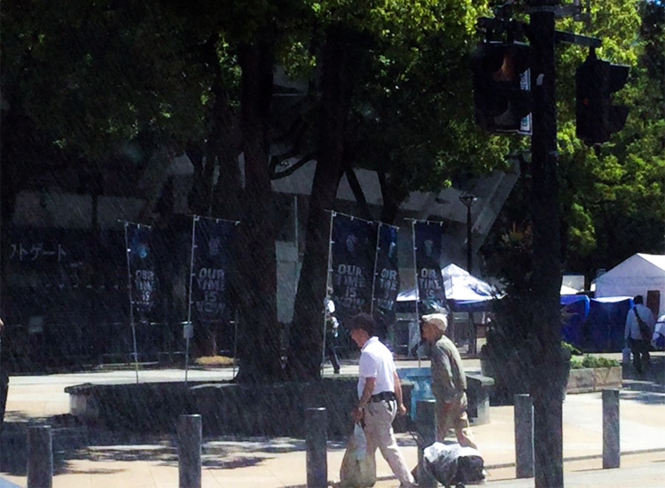 スタジアム横を通ると、「OUR TIME IS N.O.W」(すべては、この時のために)の新スローガンが掲げてあります。