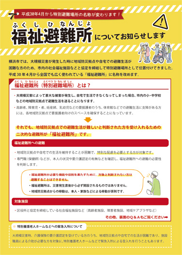 横浜市では、高齢者や障害児者、妊産婦、幼児などの要援護者のうち、体育館などでの避難生活に支障のある方々のための特別避難場所を、平成30年4月より「福祉避難所」という名称に改めます。