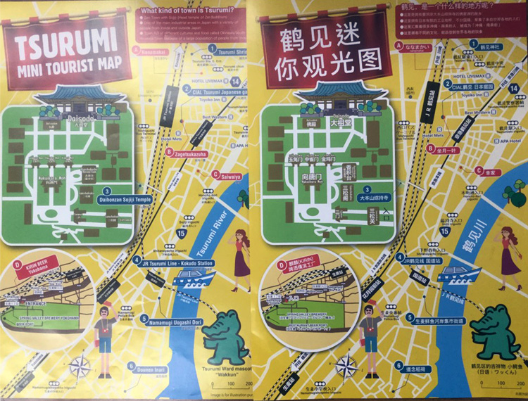 この度、鶴見区役所では横浜商科大学とのコラボレーションにより、外国人向けの「TSURUMI MINI TOURIST MAP」を発行しています。 英語や中国語で、鶴見区内のスポットの一部が紹介されています。