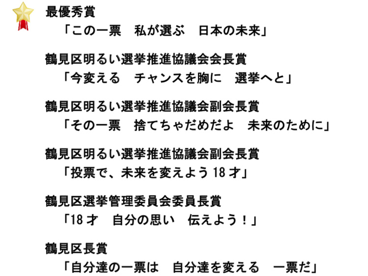 鶴見区では、政治・選挙に関心をもってもらうきっかけづくりの一つとして、区内市立小中学生を対象に標語コンクールを実施しています。 本年も233点の応募を頂き、17点の入賞・入選作品が決定しました。