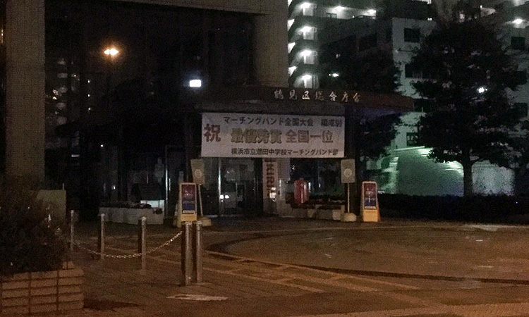 鶴見区役所の入口には、潮田中学校マーチングバンド部の全国大会2連覇の横断幕が飾られていますが、子供達の活躍が地域の方々にも拡がっています。