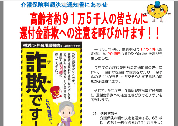 横浜市では、介護保険料額の決定通知書の送付に合わせて、約91万5千人の高齢者の方々に、還付金詐欺への注意を呼びかけるチラシを配布する予定です。