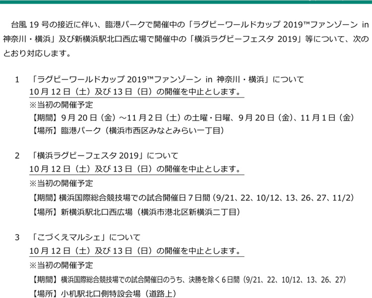 日に日に盛り上がりを見せているラグビーワールドカップ2019大会ですが、今週末の台風19号の接近に伴い、10月12日と13日に予定されていたファンゾーン等のイベントが中止となりました。