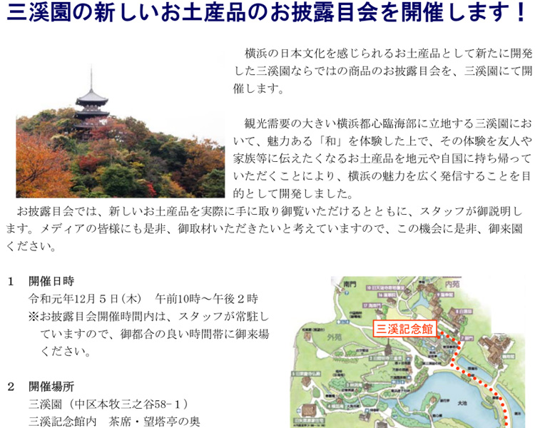 来たる12月5日に、横浜で日本文化を感じられる三溪園での新たなお土産品がお披露目されます。