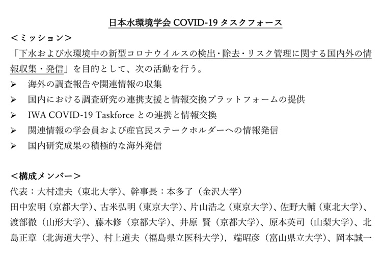 水環境分野での学術的調査等を行う公益社団法人において、コロナウイルス感染症に関連する調査研究を推進するため「日本水環境学会COVID-19 タスクフォース」が設置され、横浜市にも下水中の新型コロナウイルスの調査への協力要請がありました。