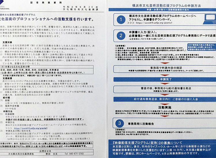 コロナウイルス感染症による影響は、文化芸術分野でも大きなダメージを受けていますが、今般、横浜市では文化芸術分野における活動を生業としている方々への支援が実施されることになりました。