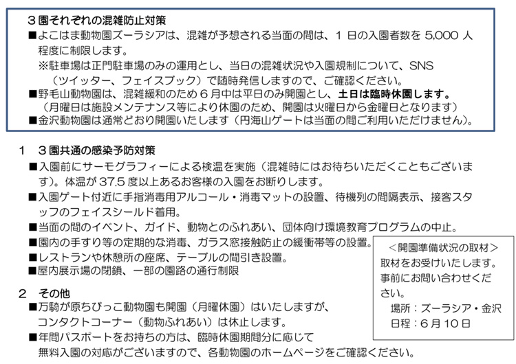 それぞれの動物園の特性にあわせて、混雑防止対策と感染拡大防止対策が実施される予定です。