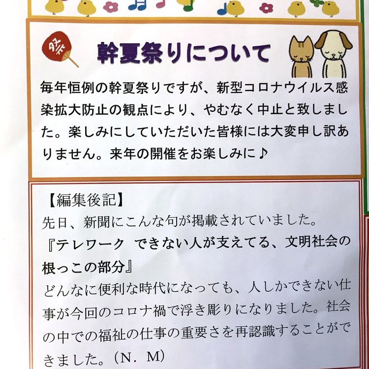 恒例となっている夏祭りも中止となり、毎回の楽しみだったカレーライスも来年までお預けです。