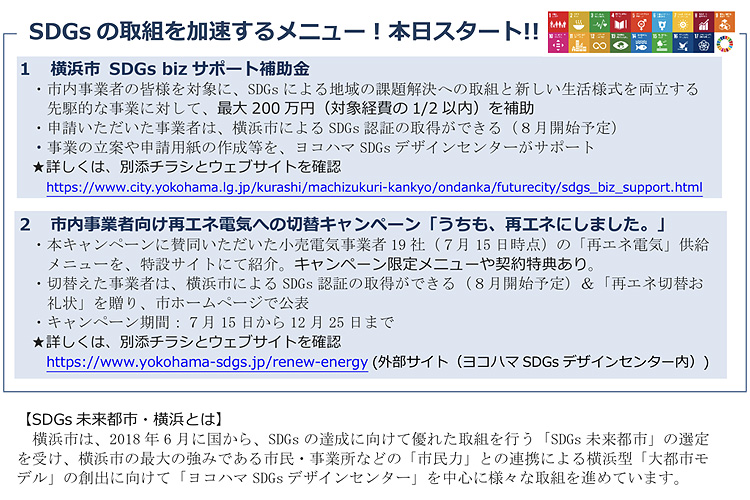 特に新型コロナウイルス感染症の影響によりパラダイムシフトが求められている今、持続可能な開発目標であるSDGsの視点により、課題解決への取組と新しい生活様式を両立する先駆的な事業の創出や、全ての施策の前提となる温暖化対策としての再エネ電気の利用促進への取組が進められます。