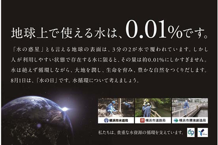 水循環基本法では、貴重な水資源や健全な水循環についての理解と関心を深めることを目的に、毎年8月1日を「水の日」と定めています。それに合わせて、横浜市では使える水が貴重であることや、水循環の大切さを考える機会の一助とするために、水循環啓発広告を作成しています。