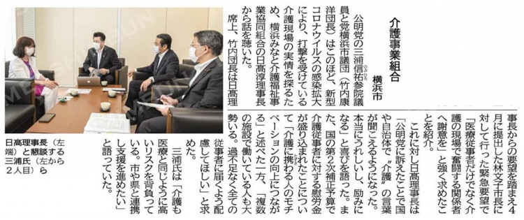 4月2日に関係者から介護現場の実情を伺い、国会議員との連携により行政当局へ支援拡充を要望していました。