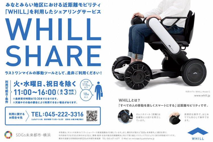 その取組の一つに、みなとみらい21地区において、近距離モビリティ「WHILL(ウィル)」を利用したシェアリングサービスの実証実験を行っています。