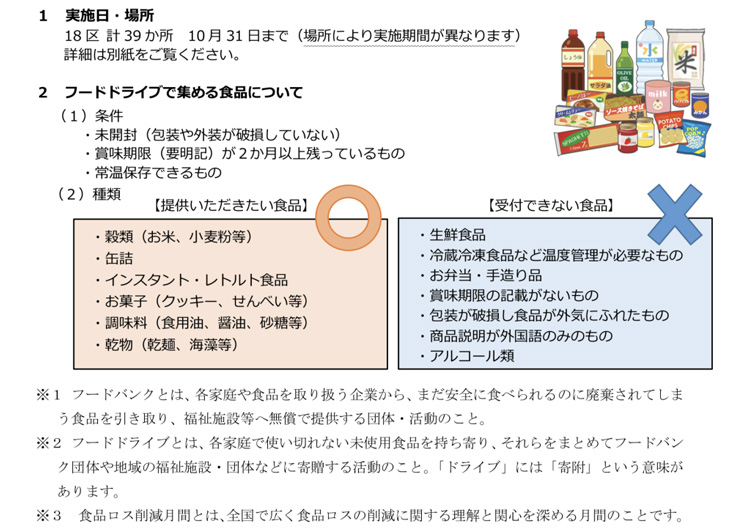 食品ロス削減月間である10月は、全区でフードドライブを実施しています。ご家庭にある未使用食品を、区社会福祉協議やフードバンク団体を通じて、食品を必要としている方へお渡しする取組となっています。