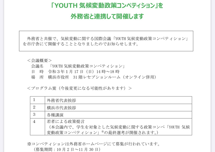 特に若い世代における意識啓発が求めらますが、来年1月には外務省と共催で、気候変動に関する国際会議「YOUTH 気候変動政策コンペティション」が市庁舎で開催されます。