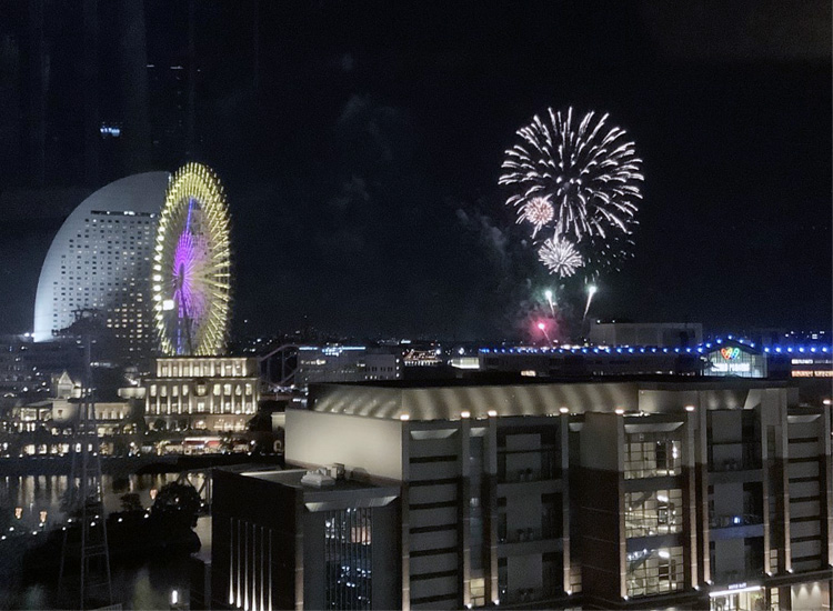 大きな音がすると思って外を見ると、みなとみらいで花火が打ち上げられていました。