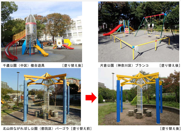 横浜市は、横浜市塗装事業協同組合と「公園施設の塗装に関する協定」を締結し、無償で各区の公園遊具などの塗装作業へのご協力を頂いています。
